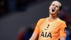 Tottenham replace goalkeeper Antonin Kinsky in the 17th minute after conceding three goals inside the opening quarter of an hour of the Champions League last-16 tie at Atletico Madrid.